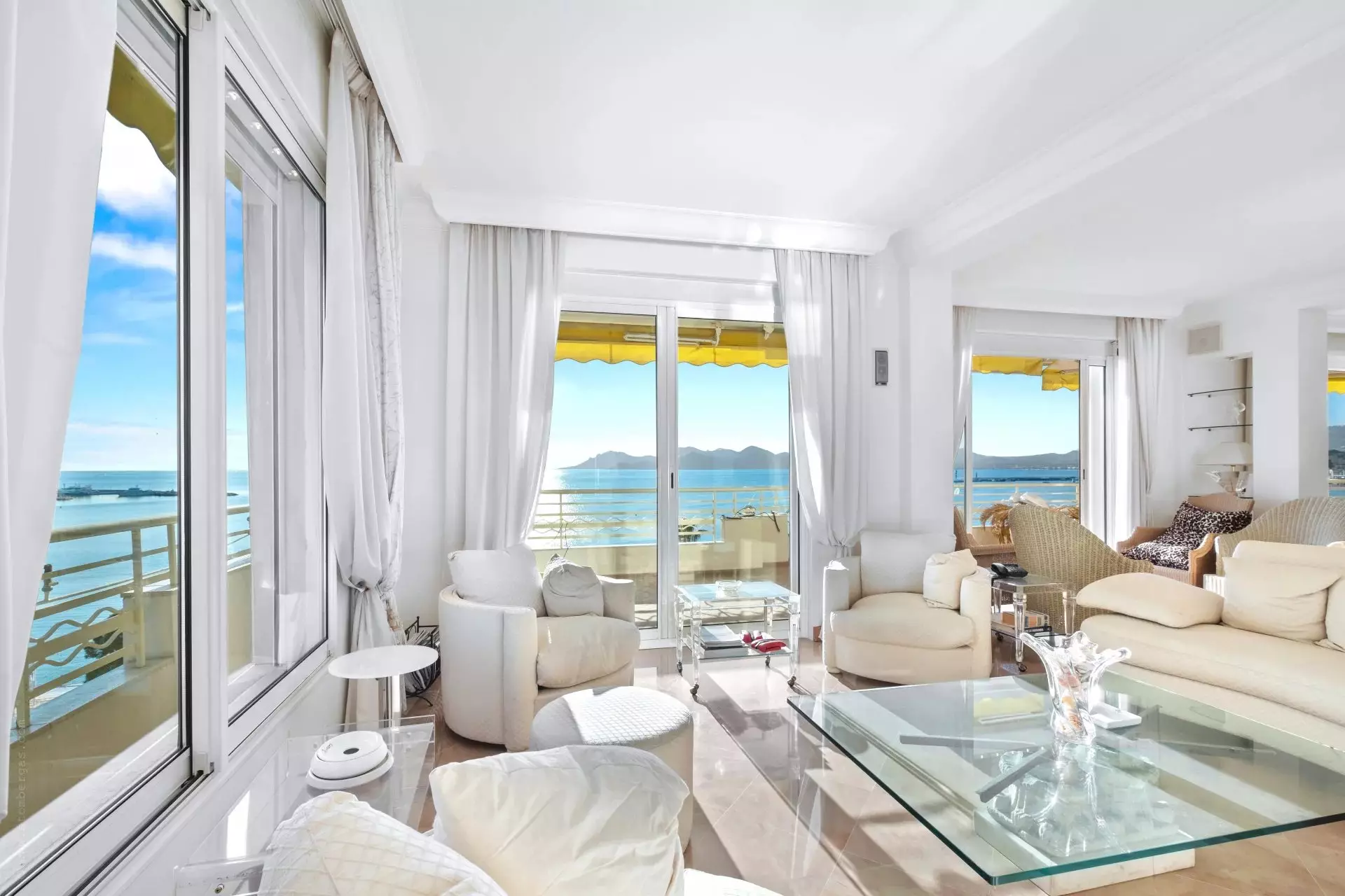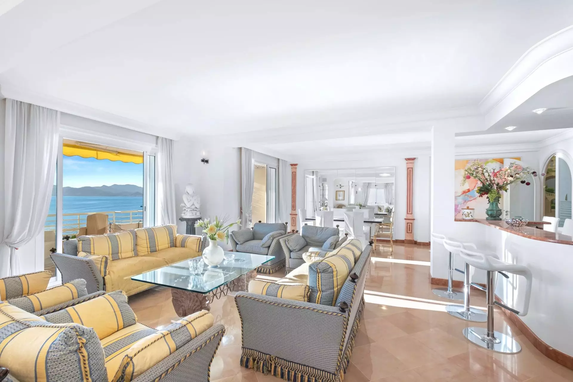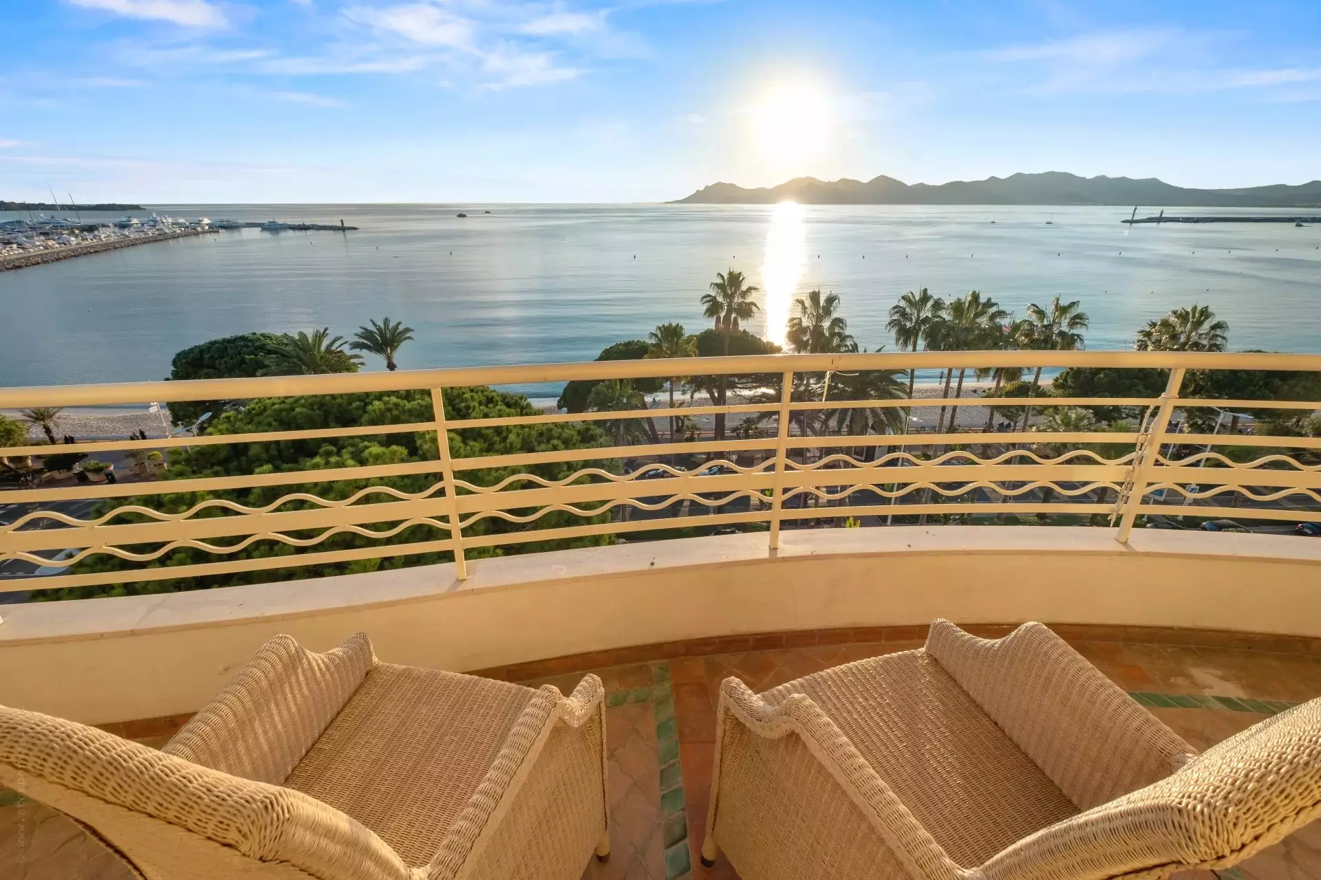 On the penthouse floor of a renowned residence on the Croisette, a magnificent 270m2 flat with a panoramic sea view over the Bay of Cannes, the Lerins Islands, and the Esterel Hills is on the market.