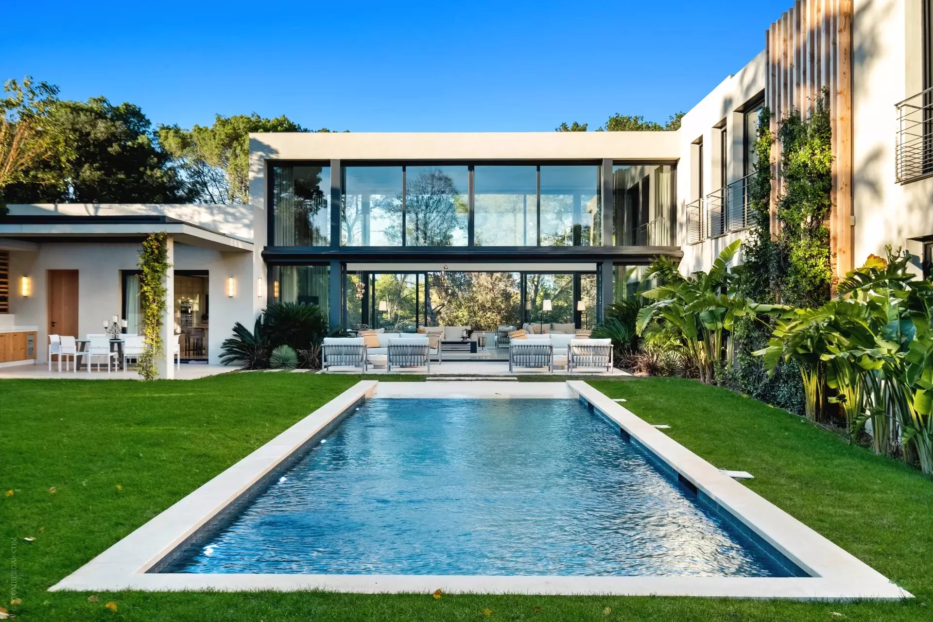Living Area: 700 m2 Bedrooms: 5 Plot: 2700 m2 Situated in the most sought-after gated domain, this magnificent new contemporary villa of 700m on 2700 m2 of flat land with a swimming pool. Ground floor: entrance, guest WC, living-dining room with 6m high ceilings, kitchen, utility room, master bedrooms, and an en-suite bedroom. Floor: office, 2nd master bedroom with terrace, two en-suite bedrooms.Complete with an elevator, home automation, home cinema, fitness, wine cellar, laundry room, games room/bar, sauna, and garage for 4 cars.